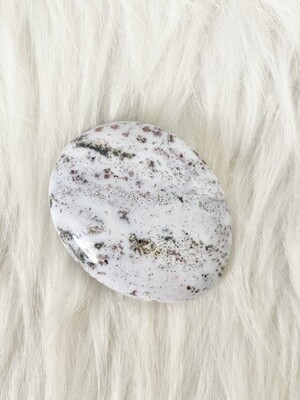 This is an orbicular ocean jasper slab with quartz druzy that measures about 4.75”.